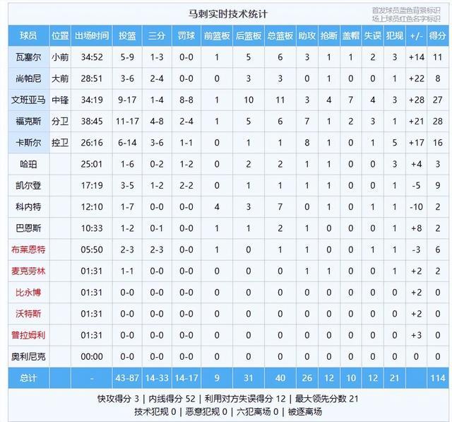数据:福克斯28分6板7助2帽、文班亚马27分11板3助4断7帽、卡斯尔16分8助、瓦塞尔11分6板3助、凯尔登9分、尚帕尼8分3板、布莱恩特6分1板1助、哈珀3分2板、科内特2分7板、巴恩斯2分2板;阿夫迪亚26分7板3助、霍勒迪20分6板4助、格兰特17分5板、卡马拉8分5板、夏普8分3板、克林根5分6板、威廉姆斯4分6板2助2帽、穆雷4分